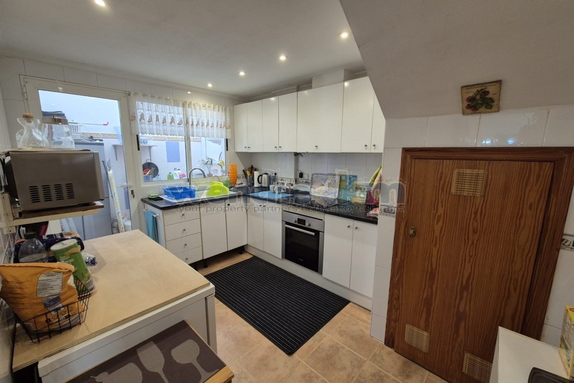 La propriété offre environ 97m² habitables avec une disposition intérieure bien pensée. Le rez-de-chaussée comprend un lumineux et spacieux salon en L avec deux ventilateurs de plafond et espace salle à manger. La cuisine indépendante offre de nombreux rangements et un cellier à l’arrière.