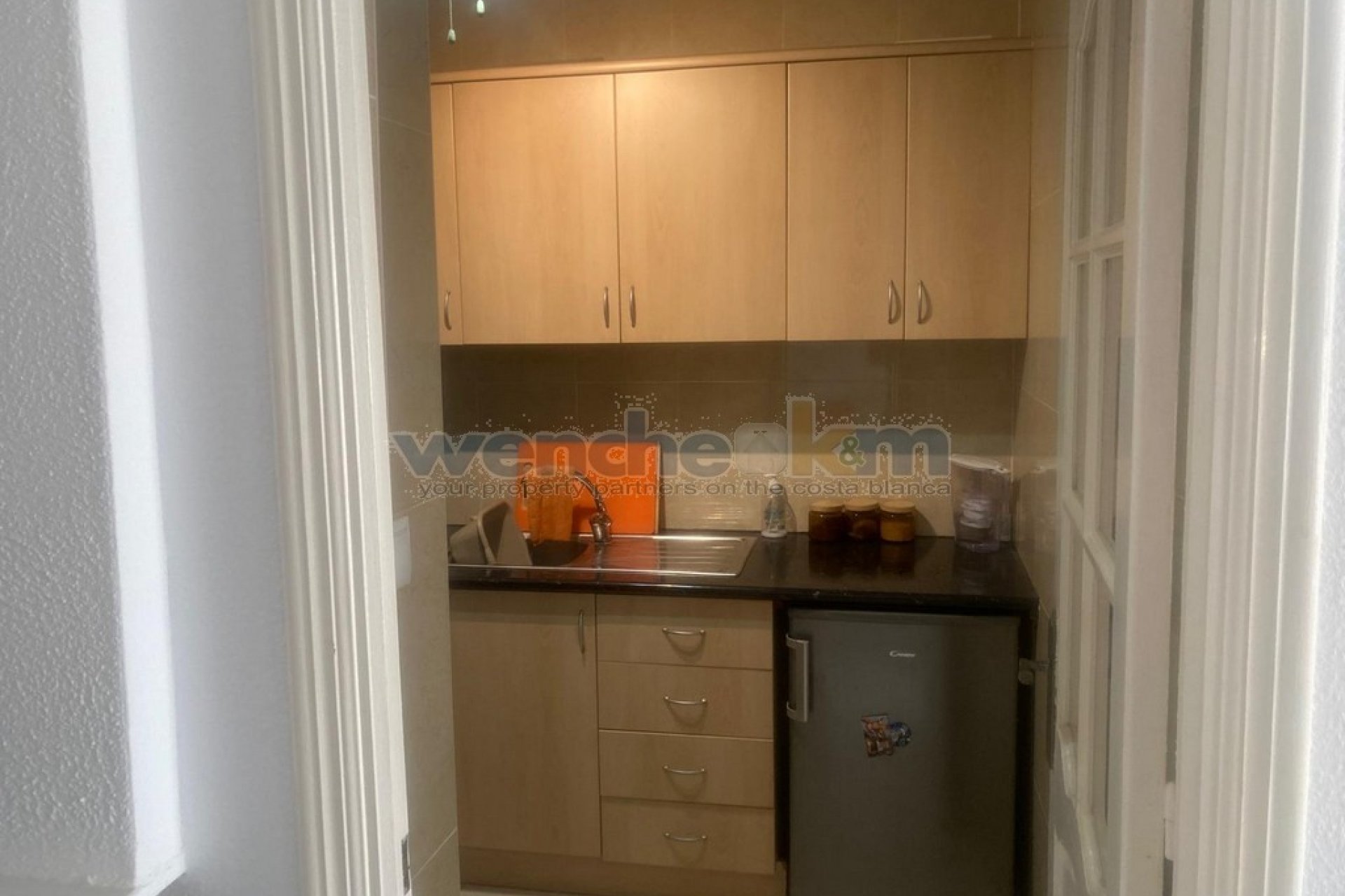Step inside to a bright and modern living room equipped with a ceiling fan and air conditioning unit. The separate kitchen at the rear includes modern appliances, such as an induction hob and under-counter fridge. A small hallway leads to two double bedrooms, one currently used as a dining room. Both bedrooms feature built-in wardrobes and ceiling fans, while the master bedroom also benefits from air conditioning. The property boasts a newly renovated family bathroom with a walk-in shower.